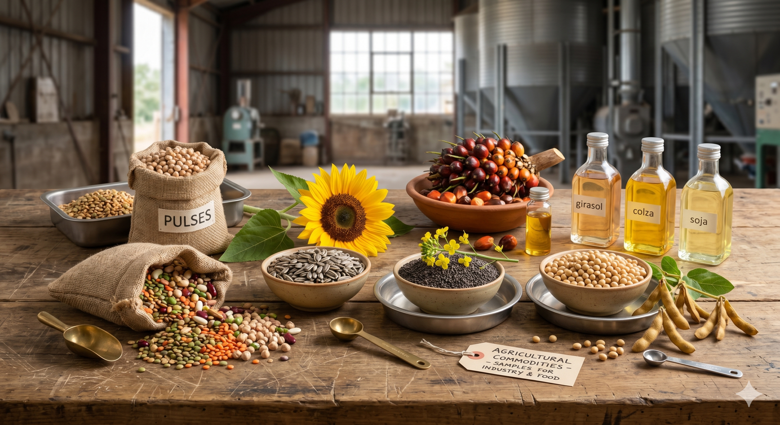 Comercialización de aceites vegetales en bruto y productos agrícolas para procesos industriales y de refinado.